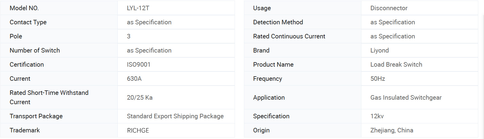 Přepínač zatížení LYL-12T splňuje relevantní požadavky GB3804-2004 "3,6 kV ~ 40,5 kV vysokopěťové napětí AC Switch" a GB16926-1997 "AC High napětí zatížení kombinované kombinované zařízení". Hlavní obvod: 630a-20ka (4s), 25ka (3S); Mechanický život: 5000krát; Uzemňovací obvod: 20ka (2S); Mechanický život: 2000krát.