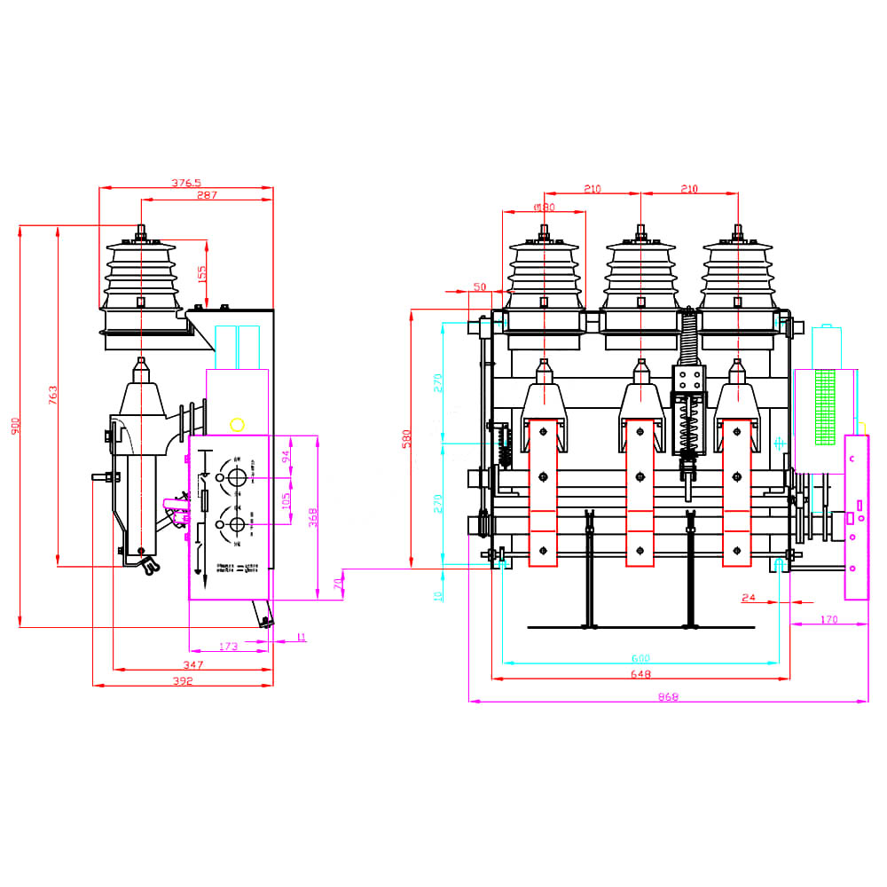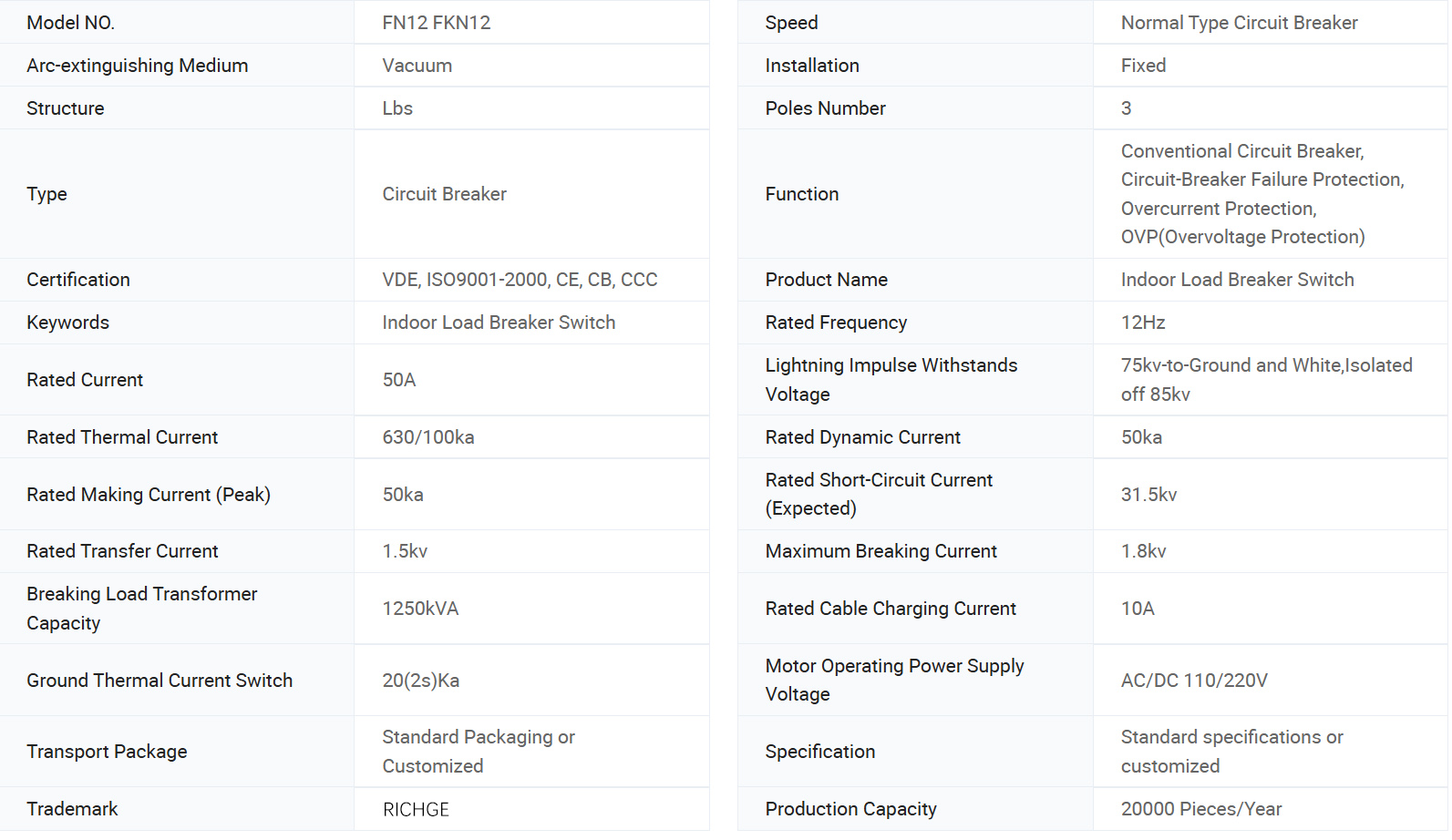 FKN12-12D/630-20 Vnitřní střídavý vysokopěťový přepínač je třífázový vysokopěťový rozváděč s jmenovitým napětím 12 kV a jmenovitá frekvence 50 Hz. Používá se pro přepínání proudu zatížení, proud s uzavřenou smyčkou, transformátoru bez zatížení a nabíjecího proudu kabelu, vypnutý kombinovaný zkratový proud. Přepínač zatížení vybavený uzemňovacím spínačem vydrží zkratový proud.