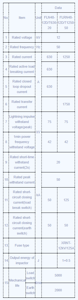 Technické parametry FLN48-12D typu Indoor HV SF6 Break Load