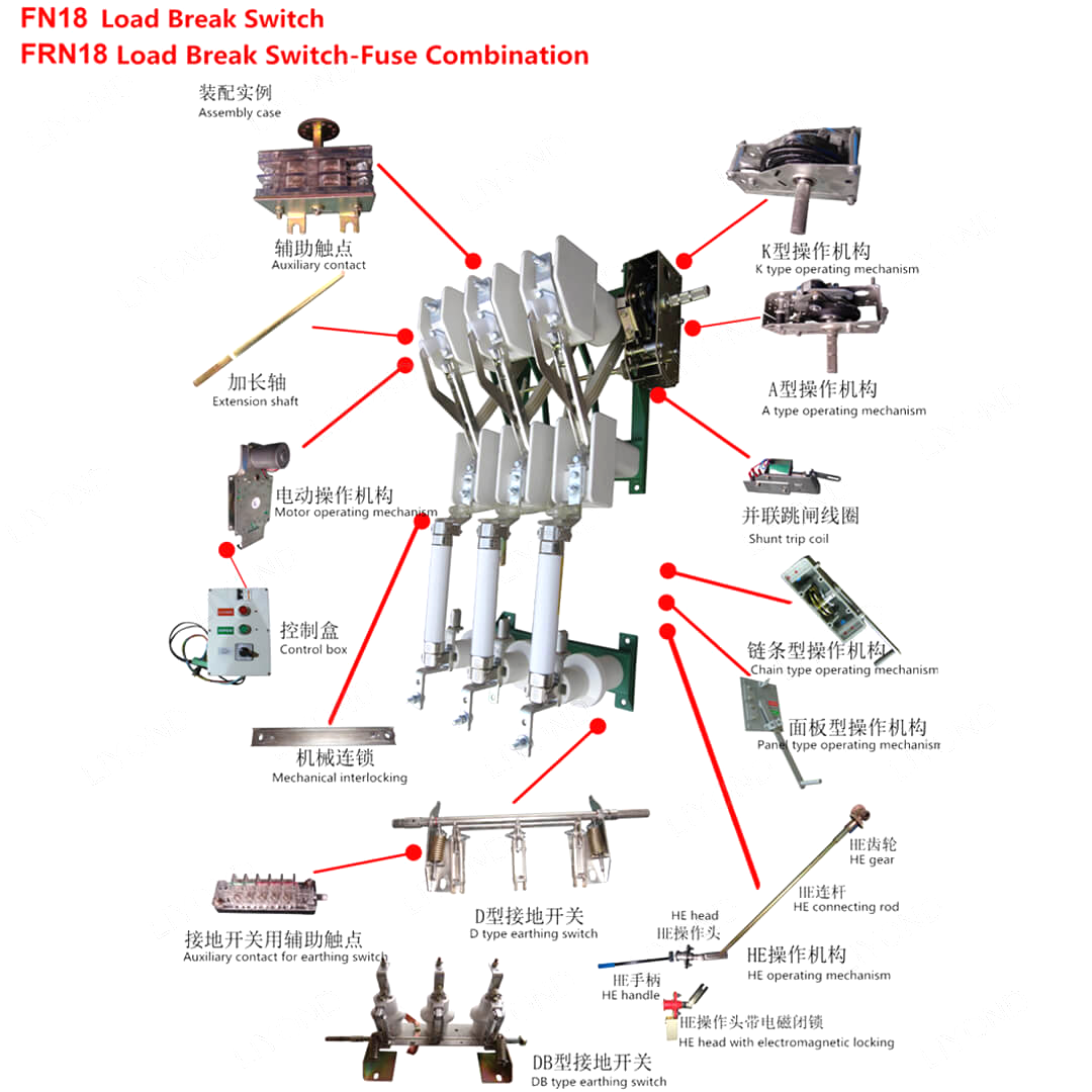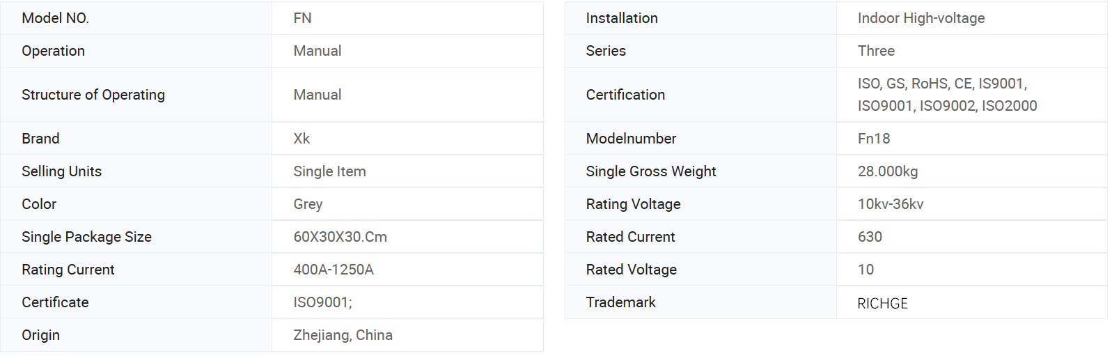 Série FN18 série Vnitřní vysokopěťová zatížení má výhody snadné design, provozu, kompaktní struktury, malého objemu, plné funkce, lehké hmotnosti, rychlé rozbití a zavírání rychlosti a vysoké spolehlivosti. Je vhodný pro AC 50Hz, jmenovité napětí 12 kV, 24 kV, jmenovitý proud 630A a třífázový distribuční systém, zejména pro projekty výstavby a rekonstrukce měst, výškové budovy, napájecí síť veřejných zařízení a je ideálním produktem pro rozvodnou typu krabic a ochranu transformátorů.
