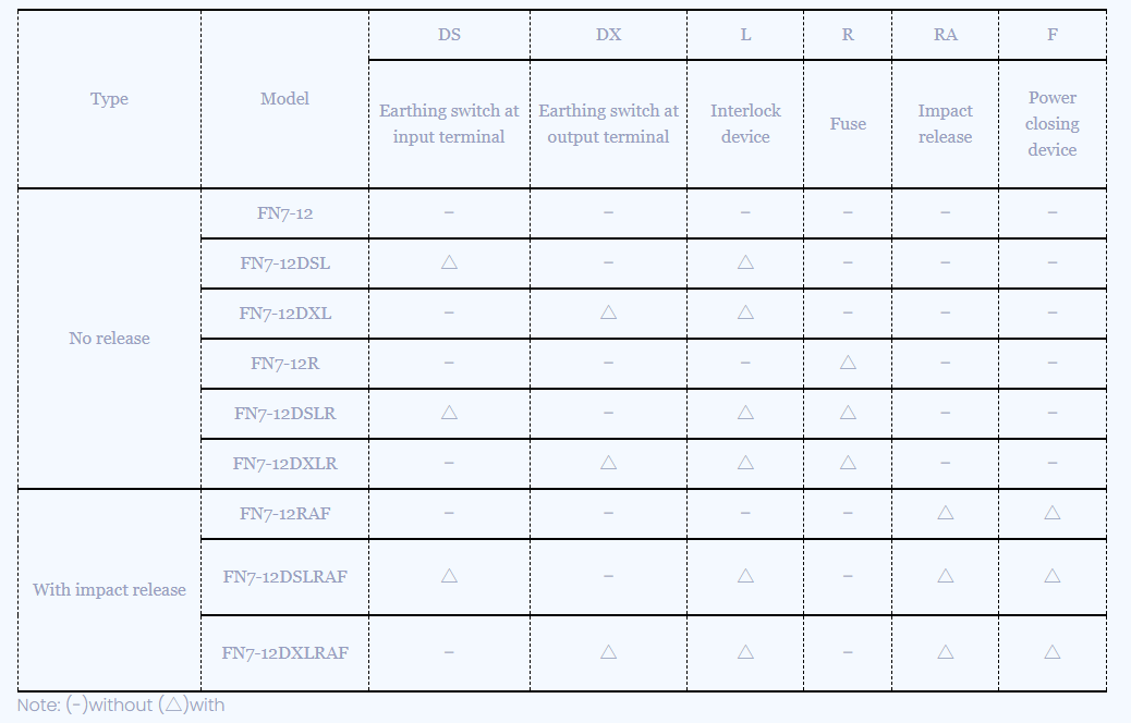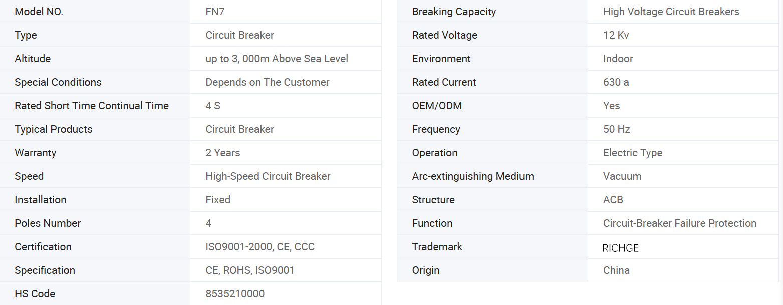 FN7-12 AC vysokopěťový spínač zatížení je nový typ vnitřního vysokopěťového spínače produkujícího plyn. Je vhodný pro třífázové střídavé energetické systémy s AC 50Hz a jmenovité napětí 12 kV. Používá se pro rozbití proudu zatížení a uzavření zkratu.