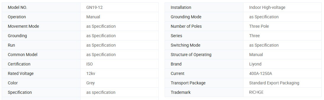 GN19-12, 12C řada vnitřních vysokopěťových přepínačů s vysokým napětím (dále jen označované jako spínače odpojení) jsou vnitřní zařízení s jmenovitým napětím 12 kV, třífázové AC 60 Hz a používají se pro dělení a uzavírání obvodů, když dochází k napětí a žádné zatížení.