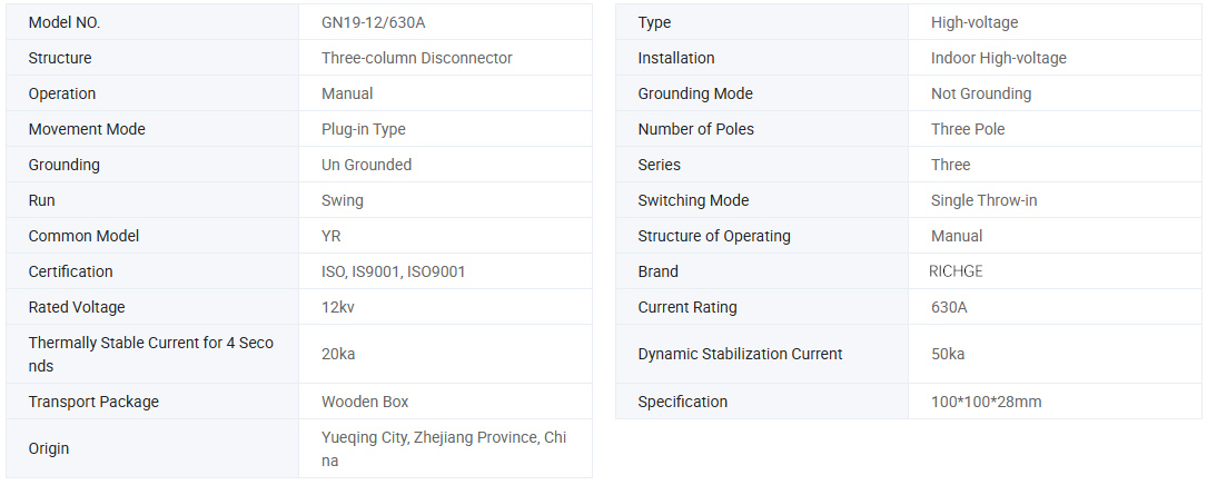 Spínač GN19-12 (c) Série vnitřního střídavého střídavého střídavého proudu je vhodný pro AC 50Hz, jmenovité napětí 12 kV a pod energetickým systémem, je vybaven manuálním operačním mechanismem CS6-1 a používá se k prolomení a vytváření obvodu pod zatížením. Existují další typ znečištění, typ vysoké nadmořské výšky a typ o výkonu. Je vyroben jako IEC 62271-102. Používá se pro přepínání elektrických spotřebičů pod podmínkou napětí, ale bez zatížení, jsou také odeslány k výrobě typu proti fúzi, typu náhorní plošiny a živá zobrazovací zařízení, která lze nainstalovat. Izolační spínač s vysokým napětím GN19-12 je vnitřní zařízení s jmenovitým napětím 12 kV a třífázové AC 50Hz.