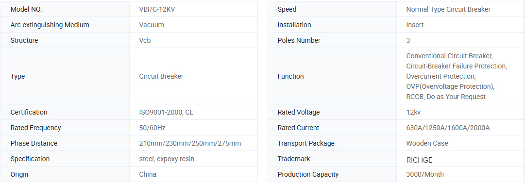 VBI-12 Střední napěťové vakuové obvody je druh vnitřního střediskového napěťového přepínače s 50 Hz/60Hz třífázovým AC 12kV jmenovitým napětím, které kombinovalo technologii společnosti ABB Corporation ve Švýcarsku a vyvinuté v Číně. Produkt splňuje standardní GB1984 a IEC62271-100.