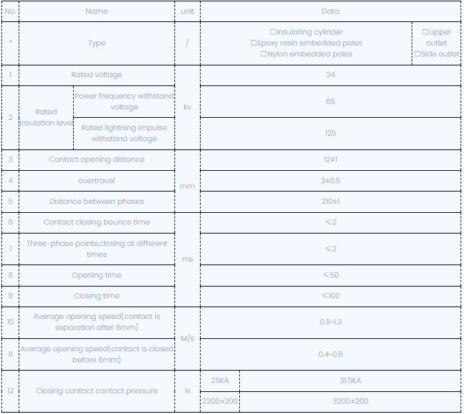Provozní mechanismus vakuového obvodu na bočním typu VBI-24 se používá pružina pro skladovací energii, která může být ovládána dvěma způsoby, manuální nebo elektrickým. Charakteristiky jsou v souladu s GB1984-89, JB3855-96<10kv Indoor High Voltage Vacuum Circuit Breaker General Technical Specifications>, Relevantní ustanovení standardu IEC56.