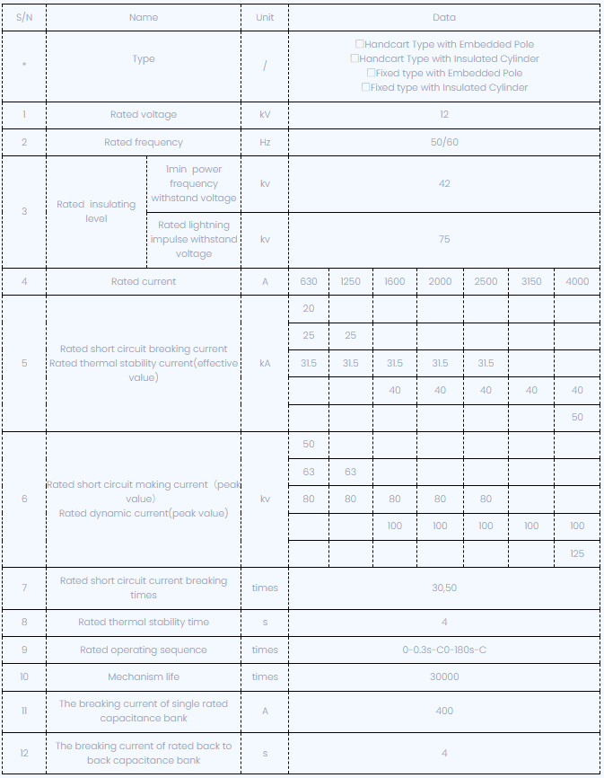 Vnitřní odběratelné vysavatelné vysavače obvodu jsou vhodné pro třífázové střídavé energetické systémy s jmenovitým napětím až do 12 ~ 24 kV a frekvence 50/60Hz. Oni se široce používají v elektrárnách, rozvozech, petrochemikáliích, metalurgii, výrobě a jiných průmyslových odvětvích, letištích, obytných oblastech atd. Ovládání a chrání elektrické zařízení, zejména pro příležitosti, které je třeba občas provozovat při jmenovitém proudu nebo více okruhu. Může být nainstalován do vnitřního rozvaděče izolovaného vzduchem, jako je typ KYN28 nebo AMS.